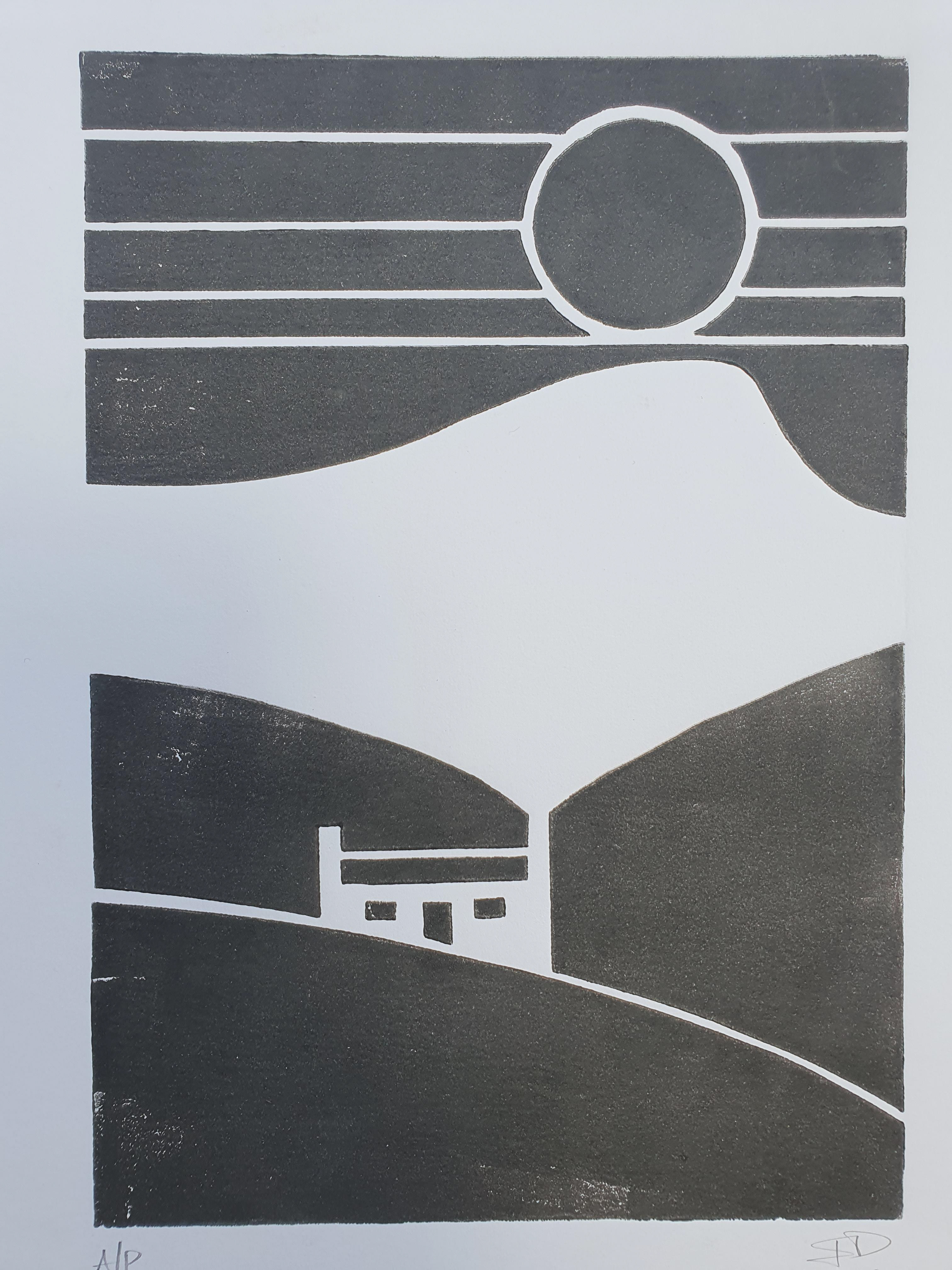 One of my earliest prints, a collagraph made in 2014. A simple croft nestled in a stylised Scottish landscape.