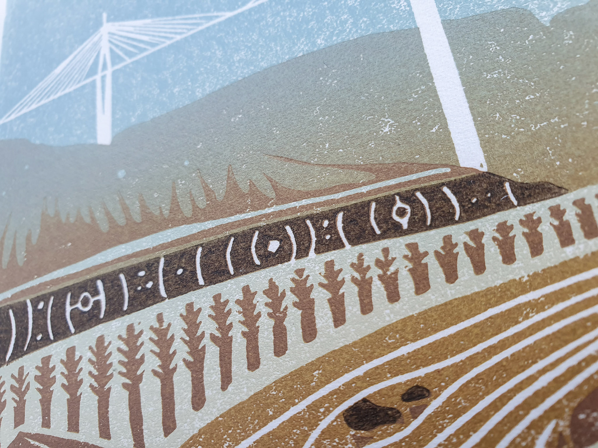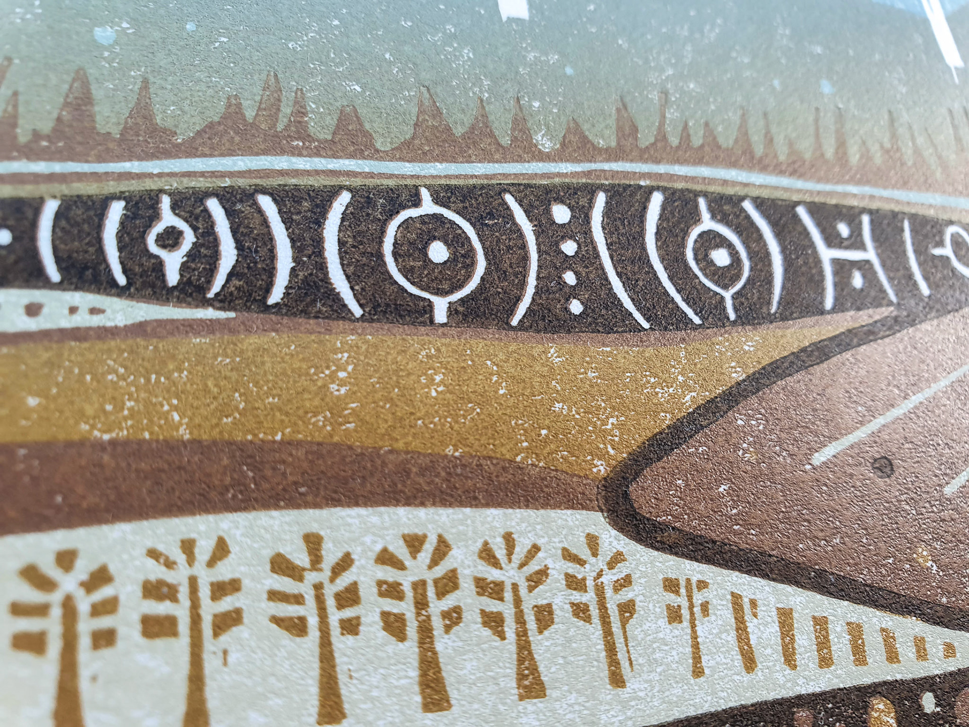 A commission produced in 2017, this represents a continuation of the combination of landscape and historical representation with patterns inspired by neolithic rock carvings.