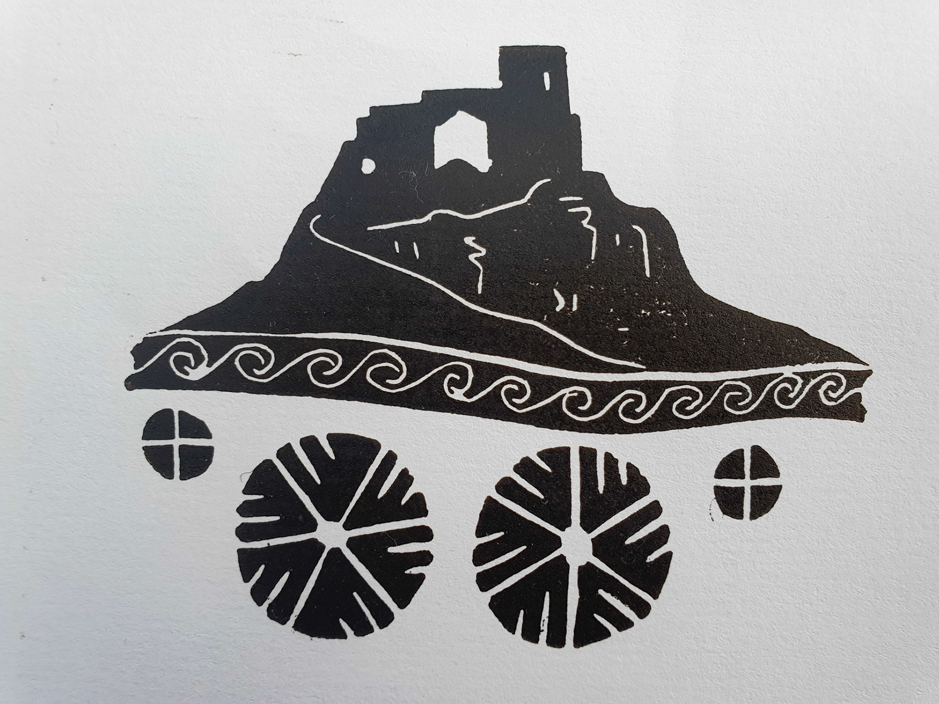 A print of a local landmark produced for a craft shop in 2016, my first piece featuring a combination of 'real' place and the symbolic pattern and millstones found locally.